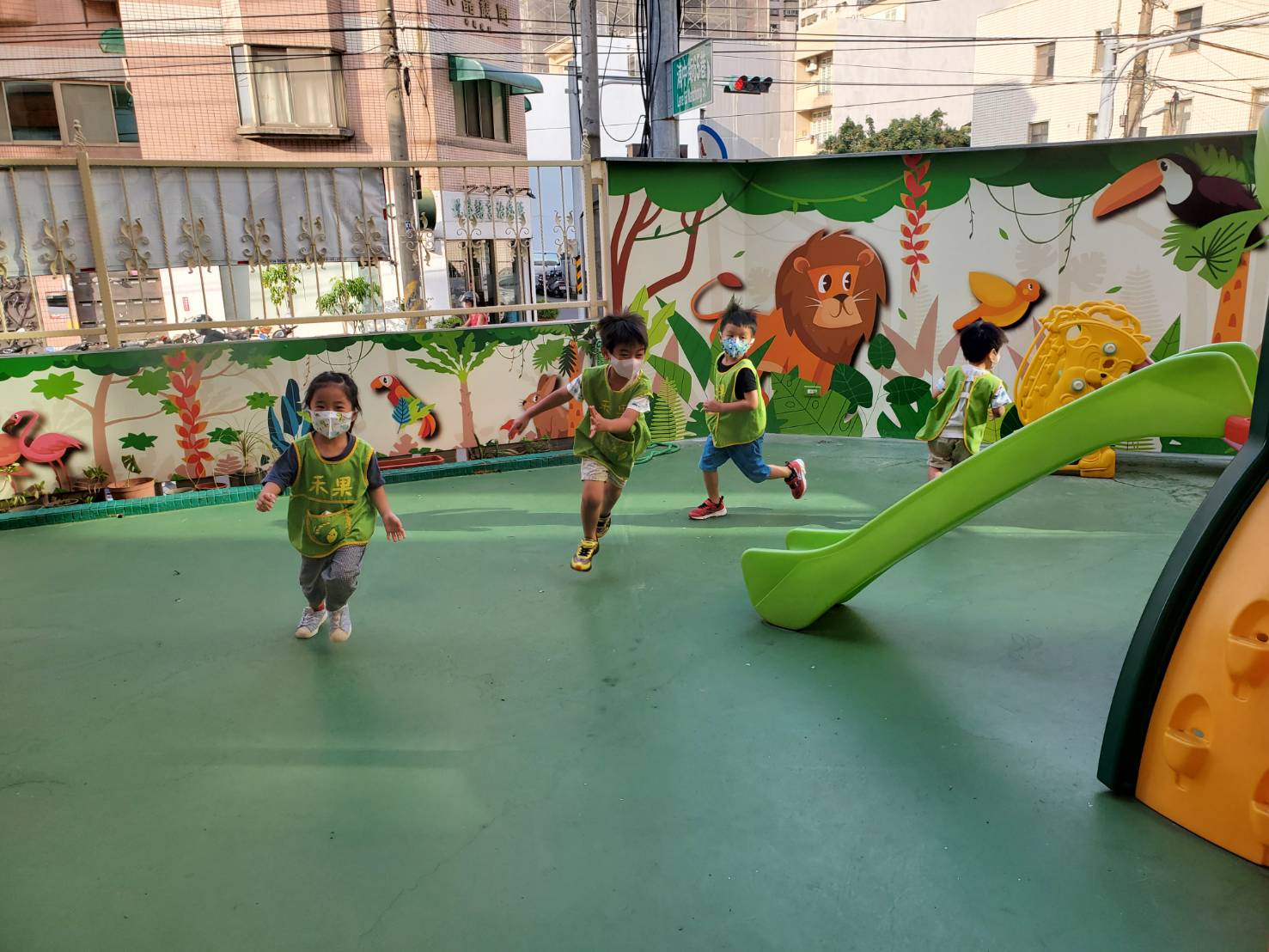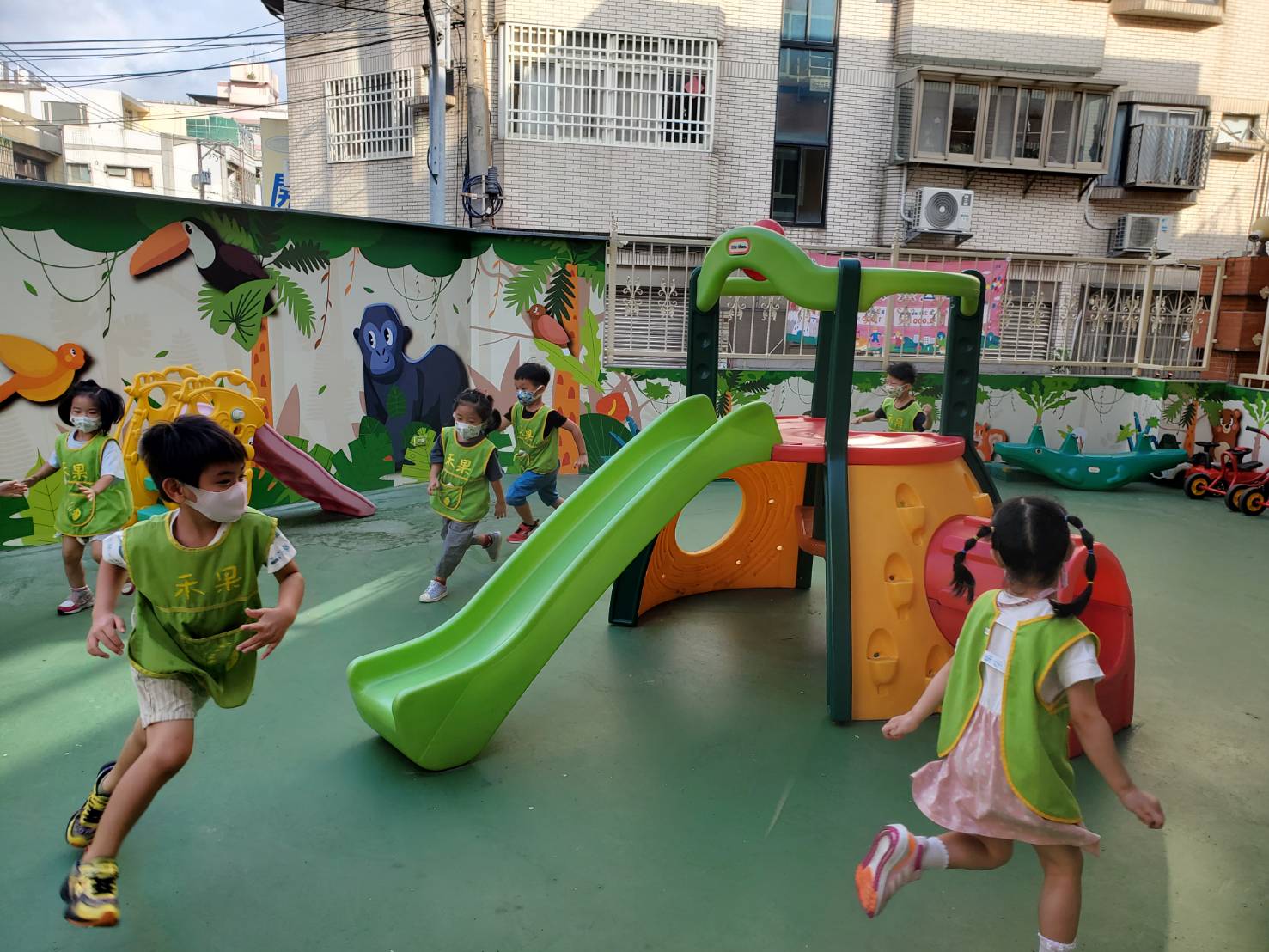 活動空間圍繞有可愛卡通圖案的彩色牆,讓孩子能在天氣舒適的時候在室外充分的活動,有時也會舉辦玩水遊戲或各項體能小遊戲,讓孩子能開心在這裡揮灑汗水。